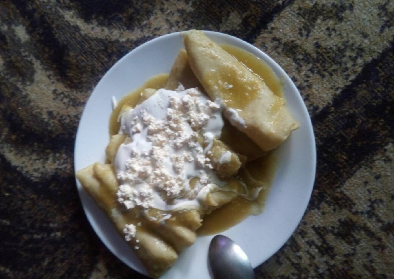 - Freímos las tortillas, metemos al caldo y rellenamos de pollo enrollamos y servimos con crema y queso.