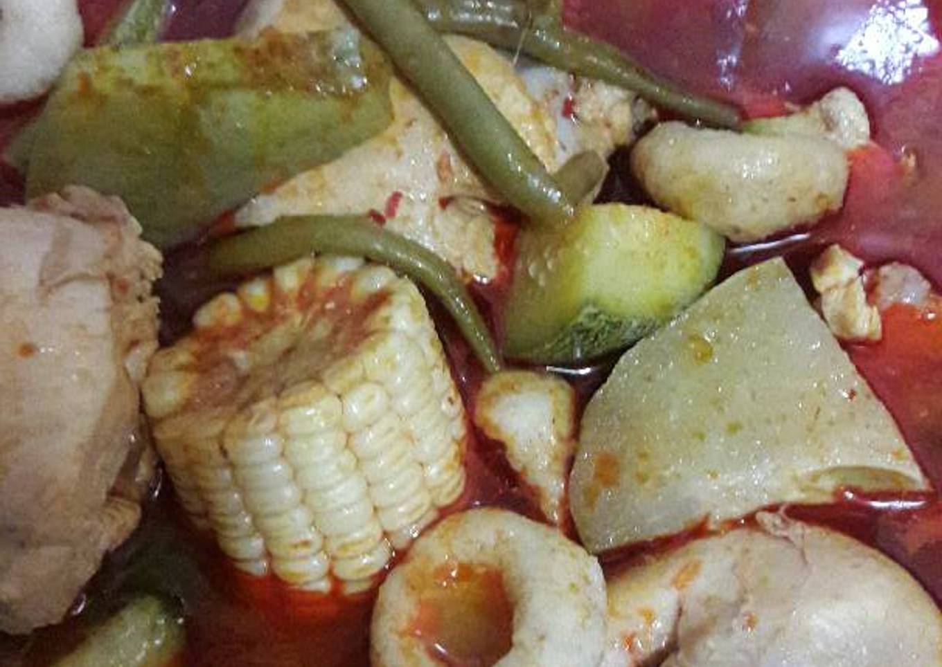 - Sofreír ajo, cebolla, chile guajillo remojar licuar y freír con poco aceite, vaciar a la cacerola, agregar agua, rama de epazote e ir poniendo el pollo y las verduras, preparas una poca de masa con sal manteca y acuyo picadito