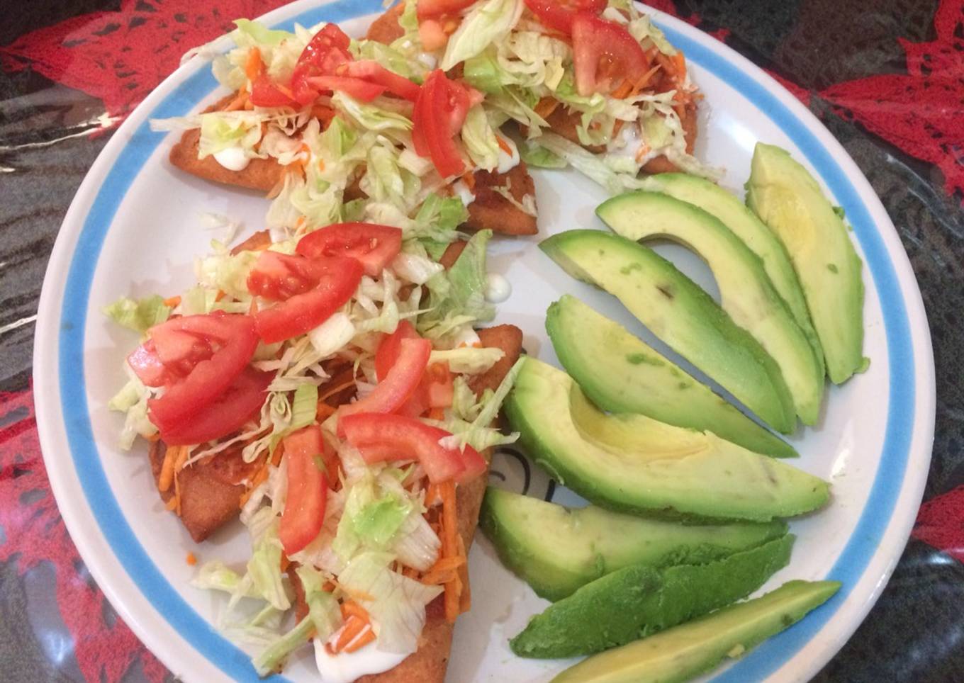 - Ponemos en el plato y agregamos crema, lechuga, tomate, zanahoria y salsa. Acompañadas de aguacate