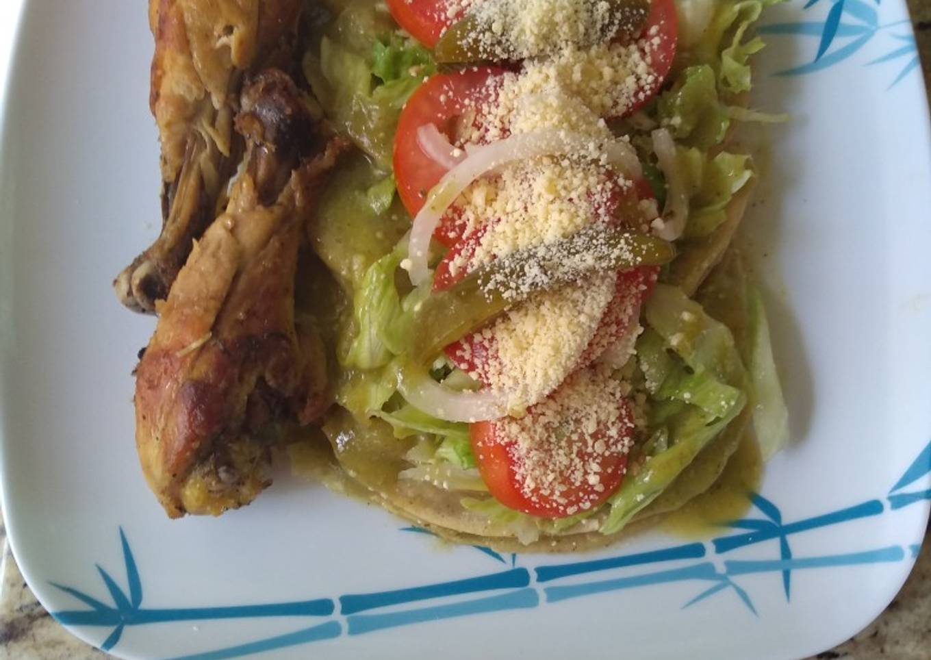 - Freír las tortillas en aceite que queden suaves, mojar en la salsa verde ponerles queso seco enmedio y doblar, colocarles lechuga picada encima y ruedas de jitomate y cebolla que sazone con vinagre de.chiles jalapeños, orégano seco, sal, y jugo de limón, ponerles más queso encima y acompañar con el pollo frito, quedan realmente deliciosas 😋😋😋