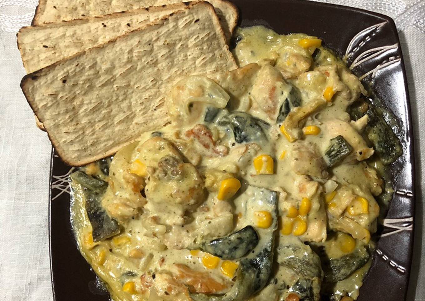 - Ponemos a fuego medio la cacerola donde freímos las rajas con la cebolla y ajo, añadimos las fajitas de pollo y la crema molida con los ingredientes.