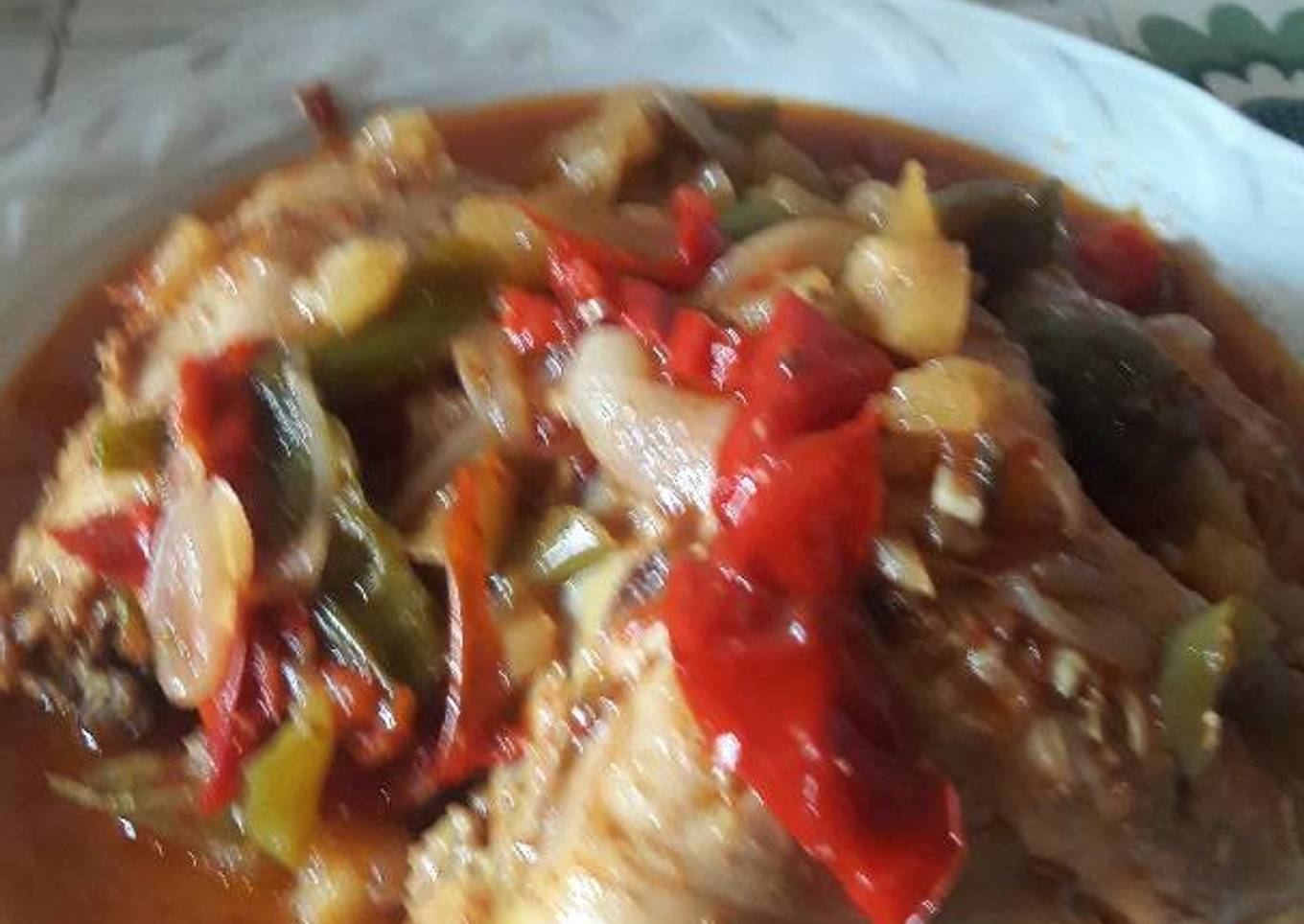 - Rociar con la salsa de soya e ir agregando los chiles morrón en julianas, la piña picada, el resto de la cebolla fileteada