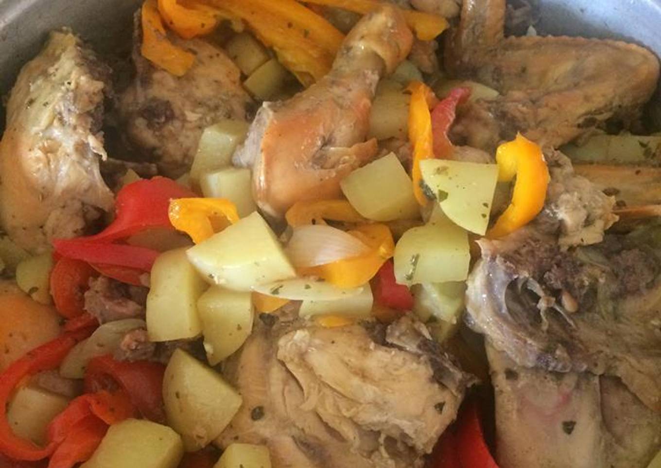 - Ya frito el pollo por los dos lados echas las cebollas, los chiles morrón cortados en tiras y las papas en cuadros medianos, 1/2 tazas de agua, yo puse algo de orégano para dar aroma