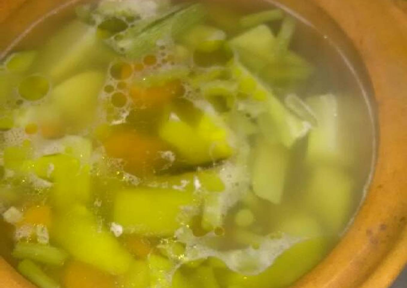- Ya hervido todo se desgrasa el pollo (sin pellejo) se retira la hierbabuena y cilantro y se agrega parte de las verduras a lo que quedó como consomé